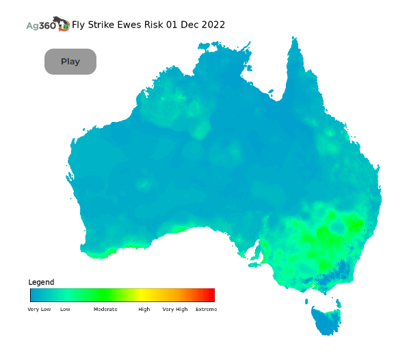 A free helpful resource is Ag360. One of its many functions is it provides a 5 day forecast for the flystrike and cold snap risks, based on the real time weather events. Below is an example of the flystrike risk for the 1st December 2022. Click on the image to go to the Ag360 website and scroll down to view the national risk maps