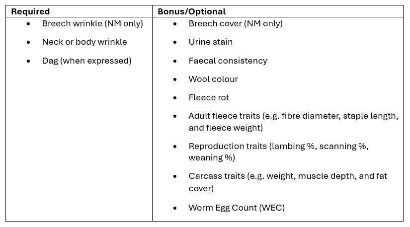 Pedigree (of struck sheep) including sire and dam - Full pedigree is preferred but not mandatory if flocks have a minimum of sire pedigree and well-recorded management groups and fixed effects.