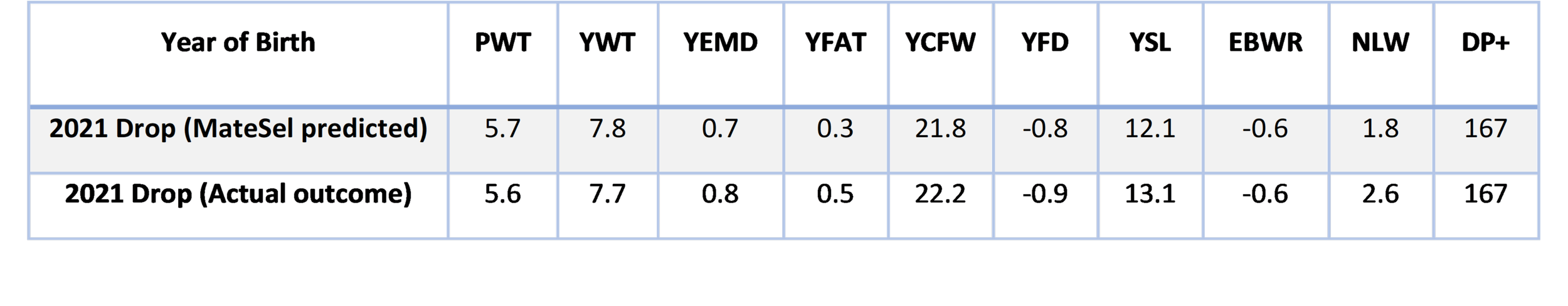 The table below provides an example of a MateSel prediction and the actual outcome for a Merino client. The variation between the two is because not all ewes got in lamb to their allocated AI sire and lambed down to a backup sire.